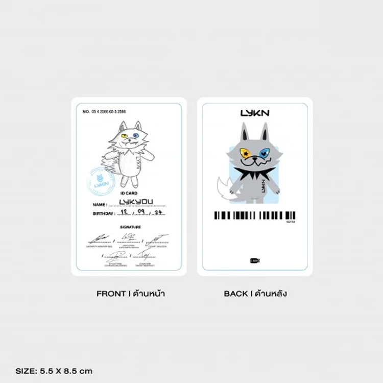 LYKYOU es el personaje de dibujos animados que LYKN diseñó para representar a sus fans. LYKYOU es un lobo gris con ojos azules y amarillos. Es adorable, genial y juguetón, y su nombre es LYKYOU. Este llavero se adapta a la perfección a cualquier prenda y luce adorable en cualquier lugar. Incluye una tarjeta de identificación con los autógrafos de LYKN.