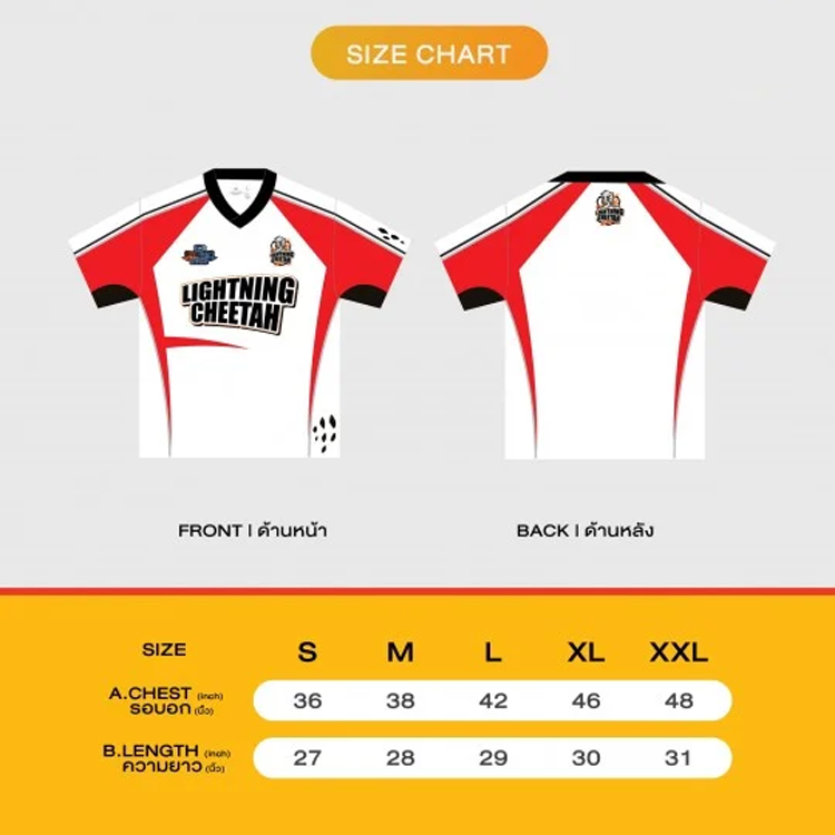 Jersey LIGHTNING CHEETAH — Jersey blanco y rojo de cuello en V con aplique del logo GMMTV STARLYMPICS 2025 en el pecho derecho, aplique del logo del equipo LIGHTNING CHEETAH en el pecho izquierdo y la espalda, y serigrafía del nombre del equipo LIGHTNING CHEETAH al centro. Confeccionado en tela Micro Sport Star Comet, suave, transpirable y de secado rápido, ideal para practicar deportes o animar.